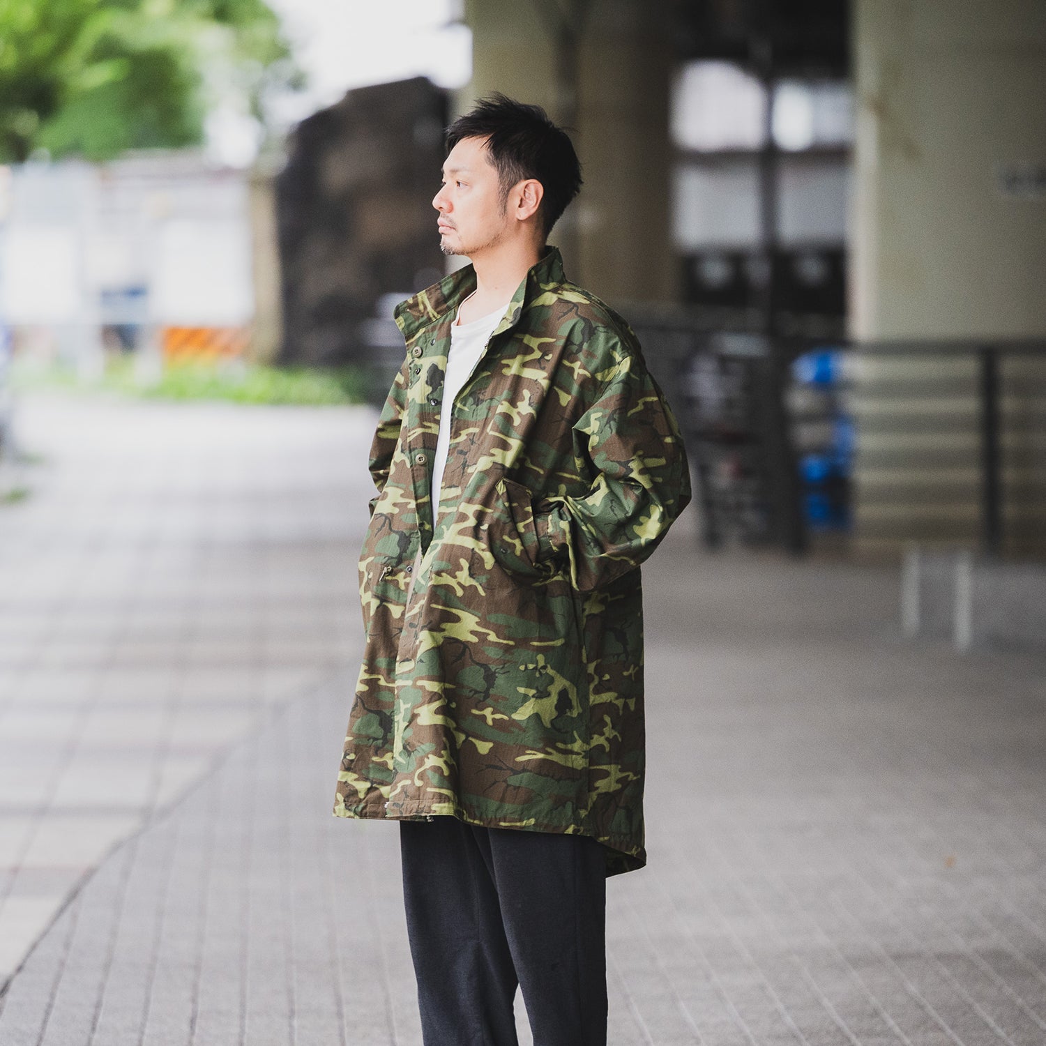 M-51パーカーの後継モデルとして誕生したM-65パーカー。本来はコットンとナイロンのオックスフォード地で構成されるモデルですが、本作では特殊部隊が使用した“ERDLカモフラージュ”柄のコットンリップストップ生地を採用。