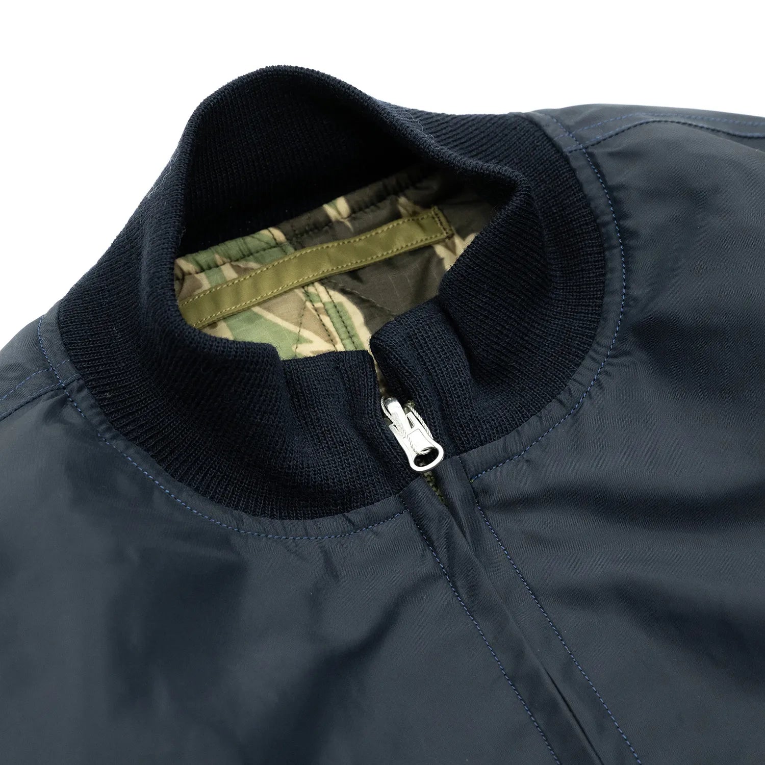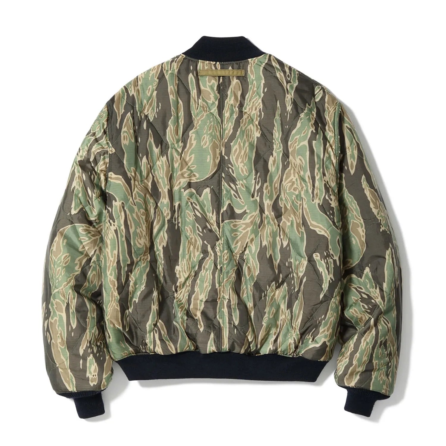 米海軍の「DECK ZIP JACKET」と米陸軍の「TANK SLASH POCKET」から着想を得て、リバーシブル仕様で仕立てたミリタリージャケット。表地にはB-15Cなどのフライトジャケットに採用される〈1/3 HEAVY TWILL NYLON〉を使用し、無骨ながらも光沢とハリのある表情を演出。裏面には瓢箪キルティングを施したタイガーカモ柄のナイロンリップストップを採用し、耐久性とデザイン性を両立。